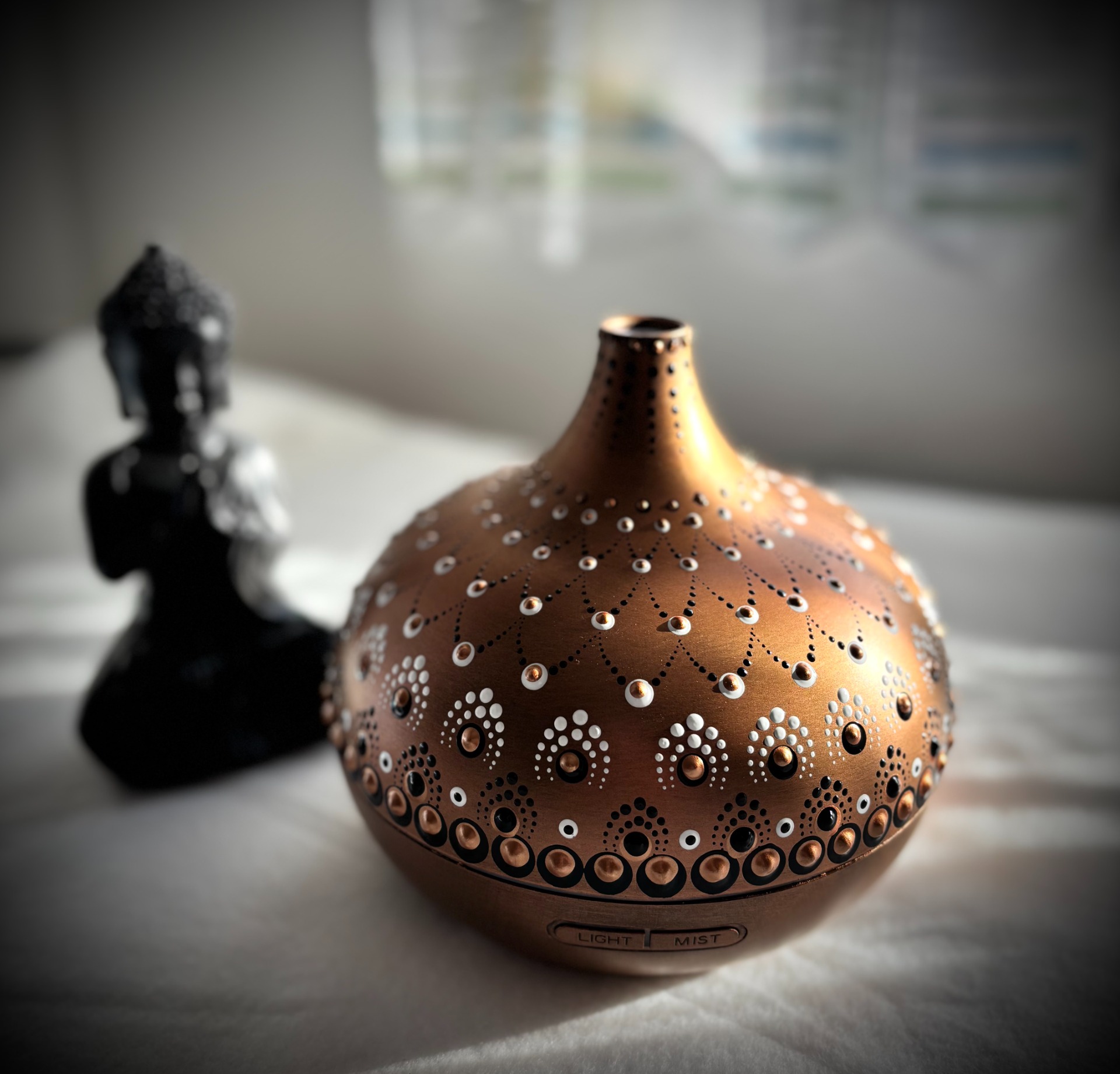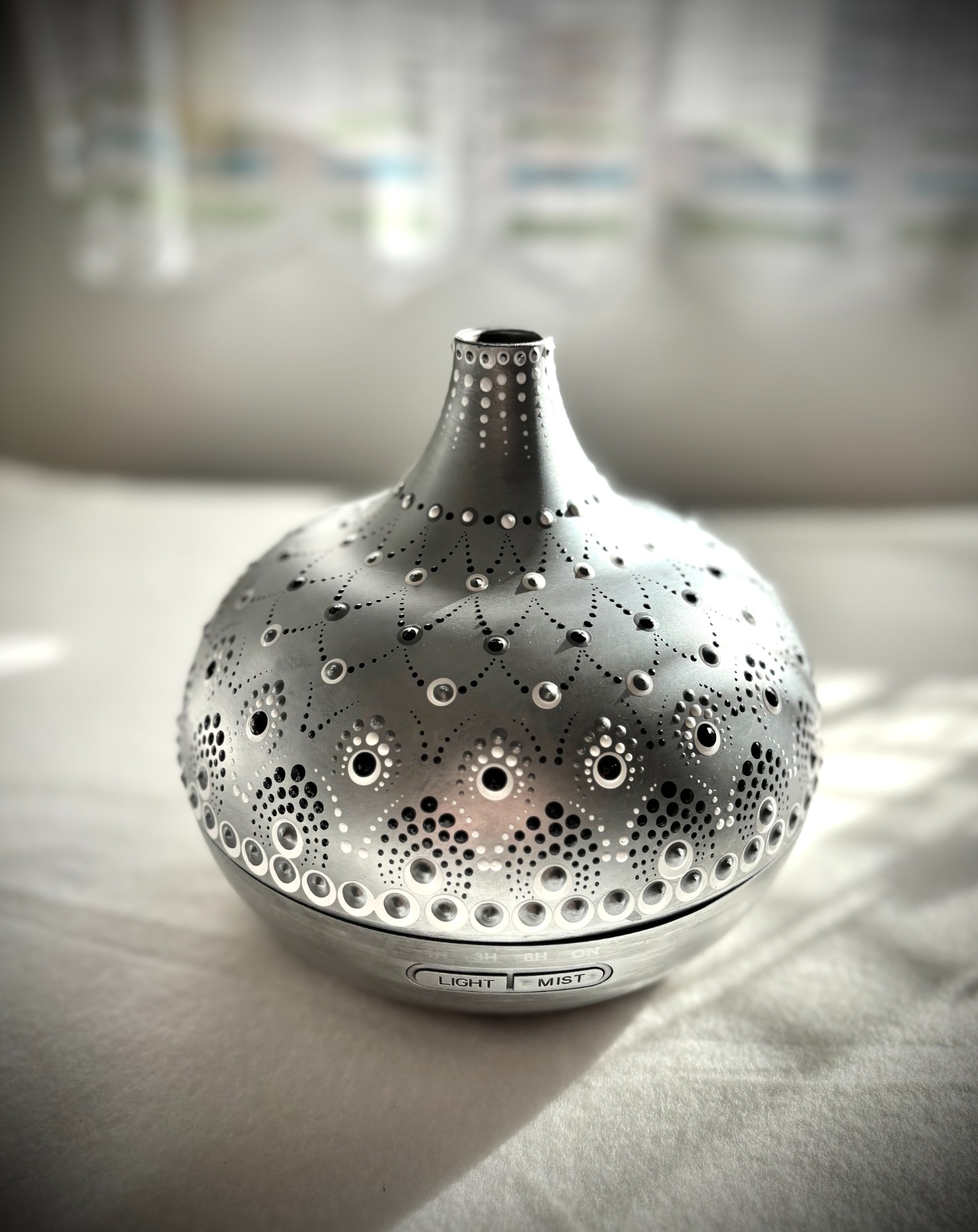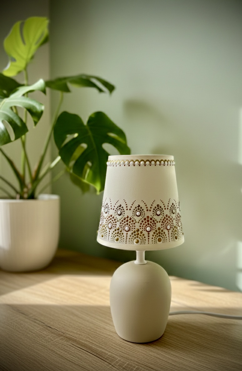 A lámpa fénye lágyan rajzolja ki a mandala mintáját a falra – így a szoba egyszerre válik meghitté, nyugtatóvá és varázslatossá.