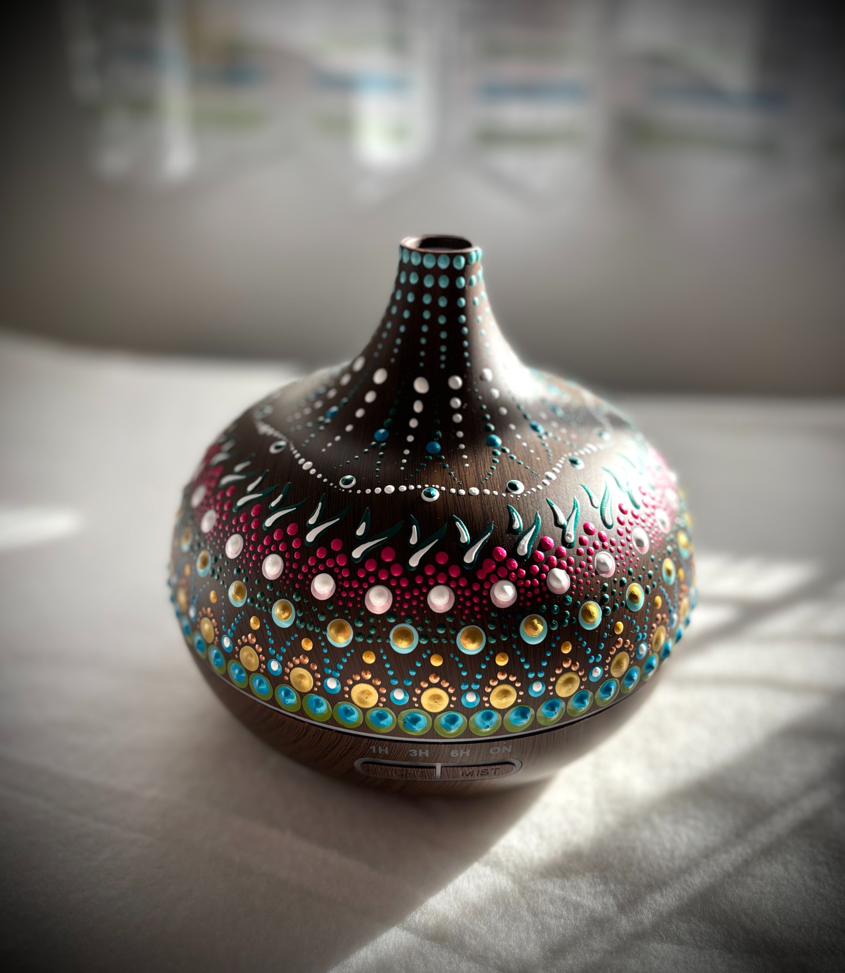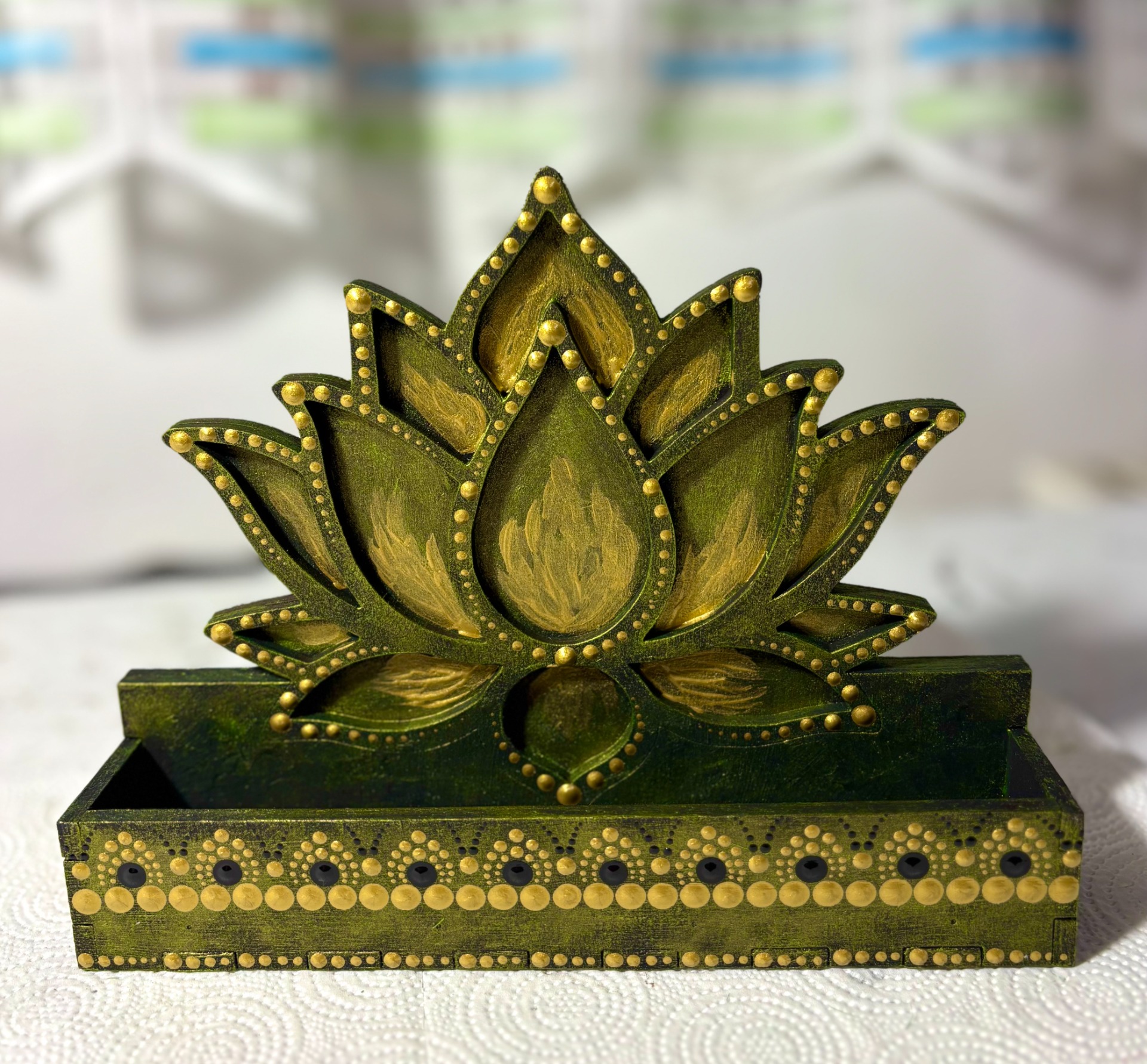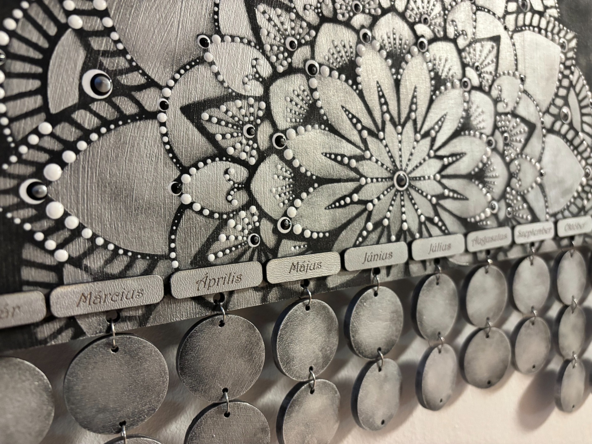 A pontokkal díszített fali kulcstartó nemcsak praktikus, hanem dekoratív és harmóniát sugárzó darab is. Minden nap találkozhatsz vele, amikor kilépsz vagy hazaérsz, így a mandala energiája és a pontozott technika apró részletei pozitív hangulatot visznek a mindennapokba.