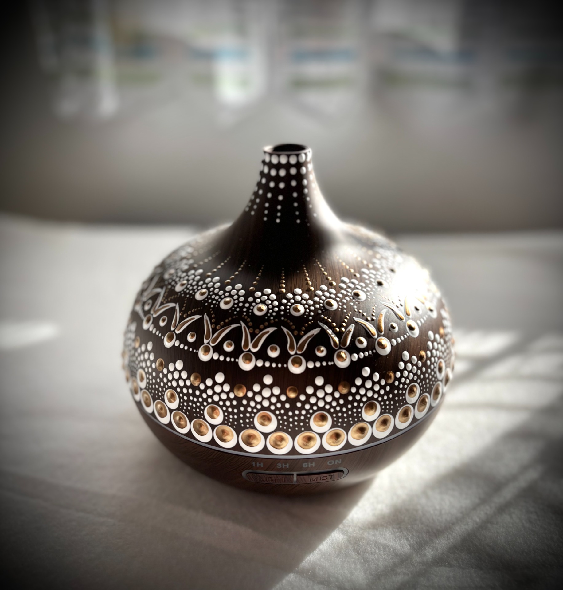 Mandalával festett asztal, mely nemcsak praktikus bútordarab, hanem különleges, pozitív energiát árasztó kiegészítő.